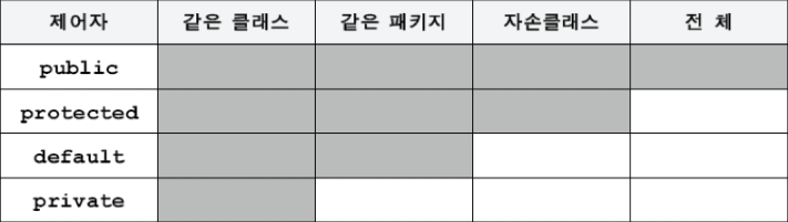 - 접근 제어자를 조상 클래스의 메서드 보다 좁은 범위로 변경할 수 없습니다.