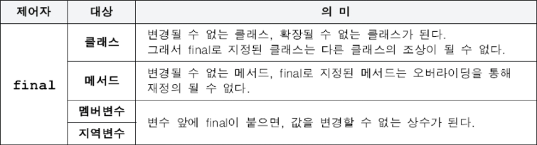 클래스, 메서드, 멤버변수, 지역변수에 final이 사용될 수 있습니다.