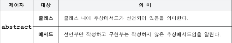 - abstract 메서드의 접근 제어자가 private 일 수 없습니다.