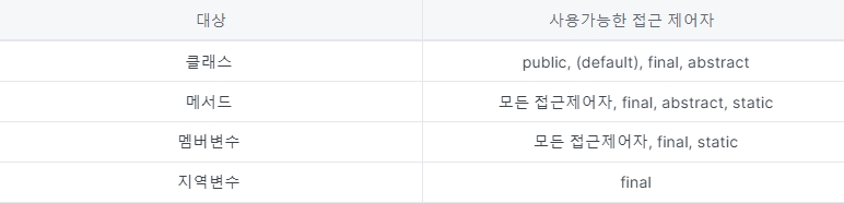 하나의 대상에 여러 제어자를 같이 사용 가능합니다.(접근 제어자는 하나만)