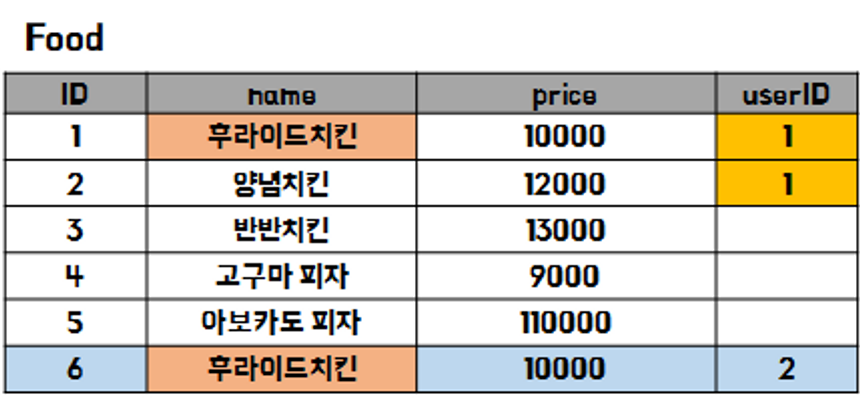 | 1 : N | @OneToMany | Order(1) : Food(N) | 주문 1개에 음식 여러개 선택 가능 |